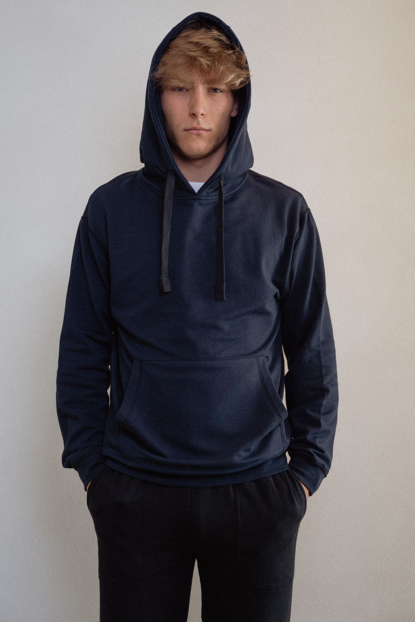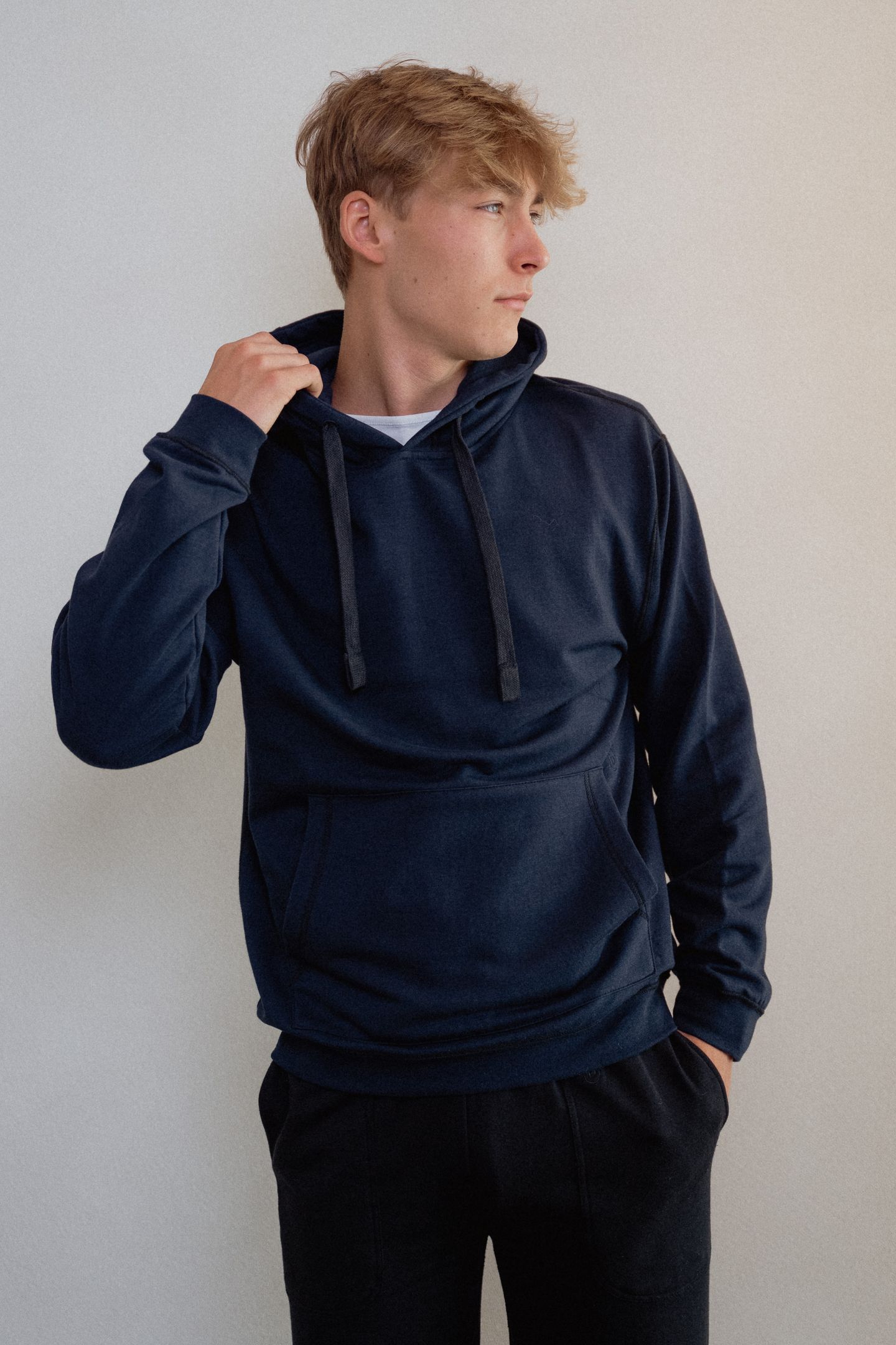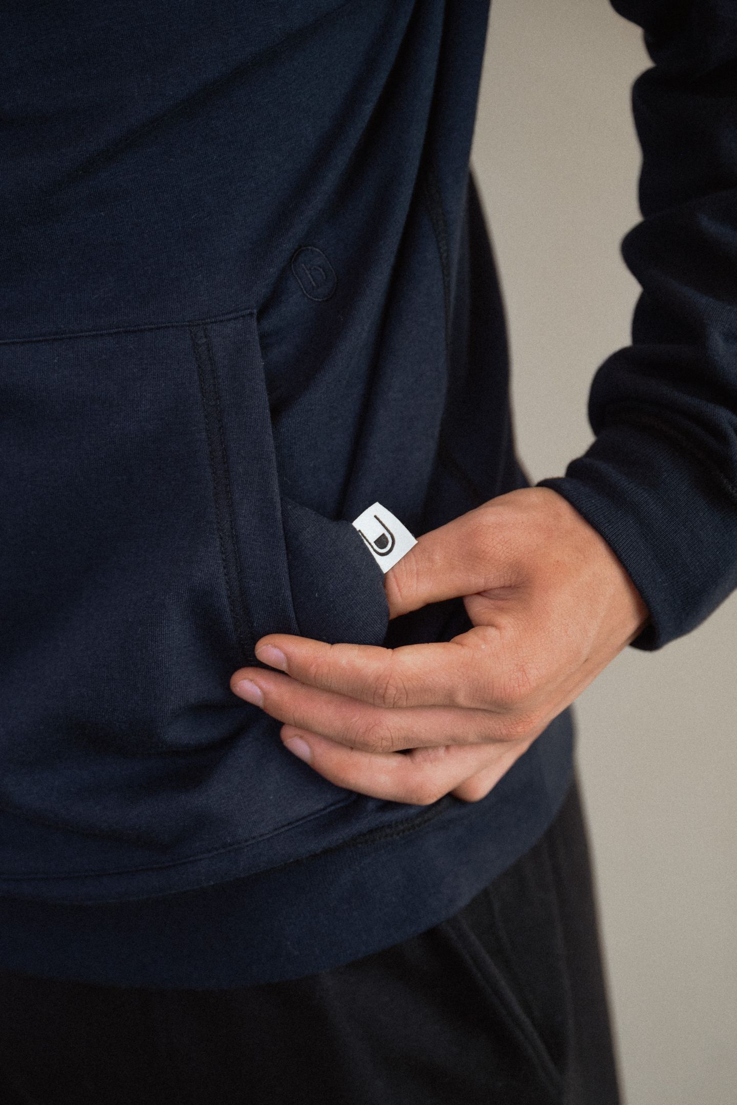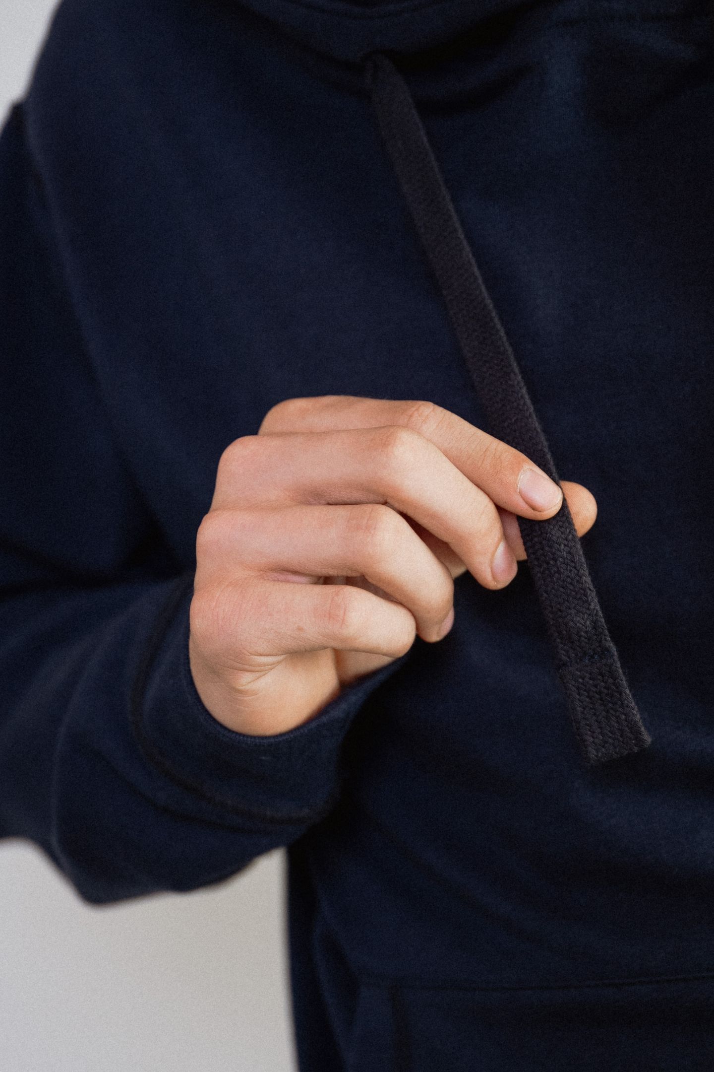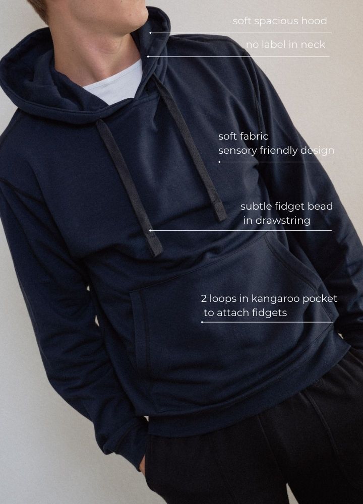 Valmistatud super-pehmest orgaanilise puuvilla ja viskoosi segust, ilma häirivate õmbluste ja siltideta. Pusa teeb eriliseks integreeritud “fidget” nöör: kapuutsipaelas on peidus helmes, mida saab sõrmedega edasi-tagasi lükata. See võimaldab rahuneda diskreetselt, kedagi häirimata. Lisaks on pusal aasad (nii nööride küljes kui ka kõhutasku sees), kuhu saab kinnitada Blusssi lisatarvikuid (stressipalle või närimisvahendeid).